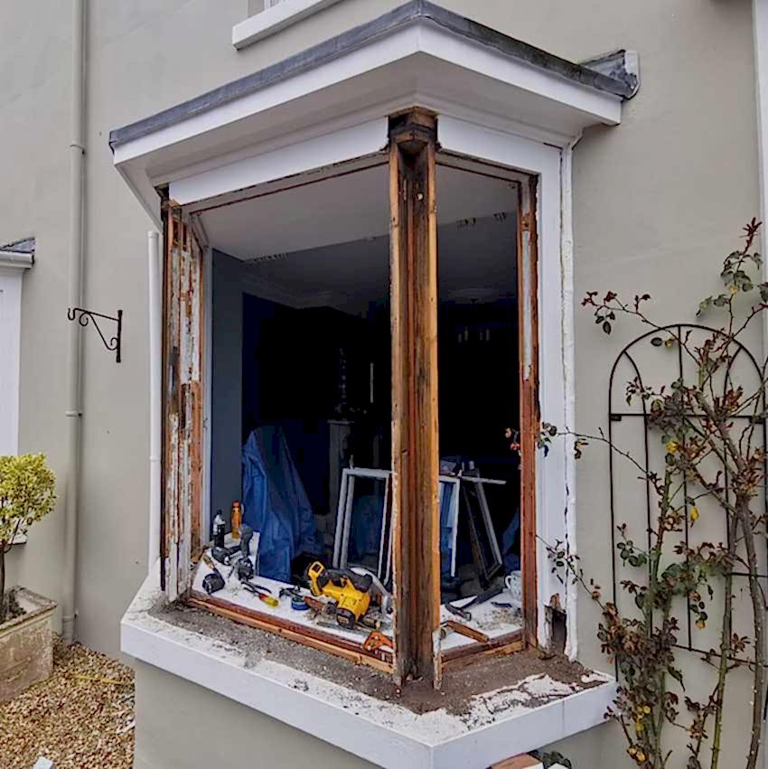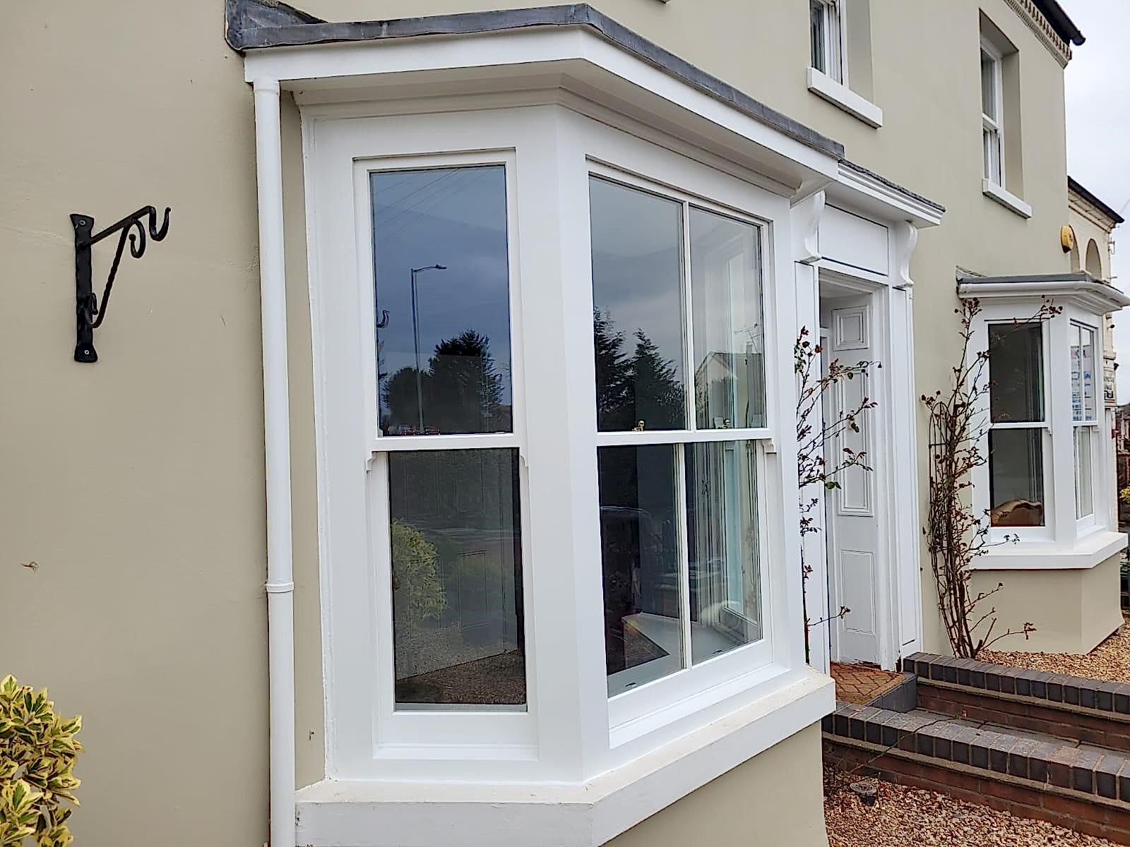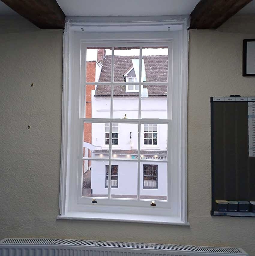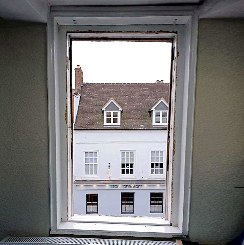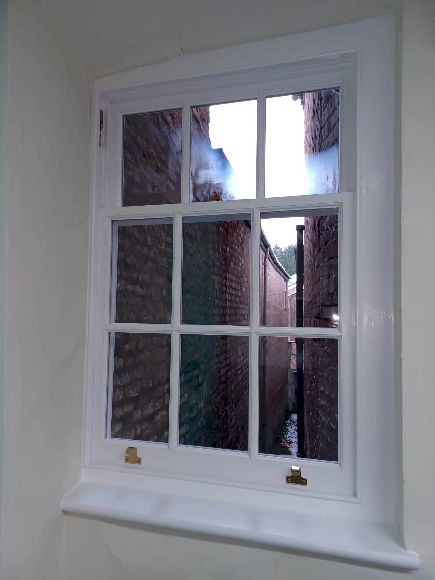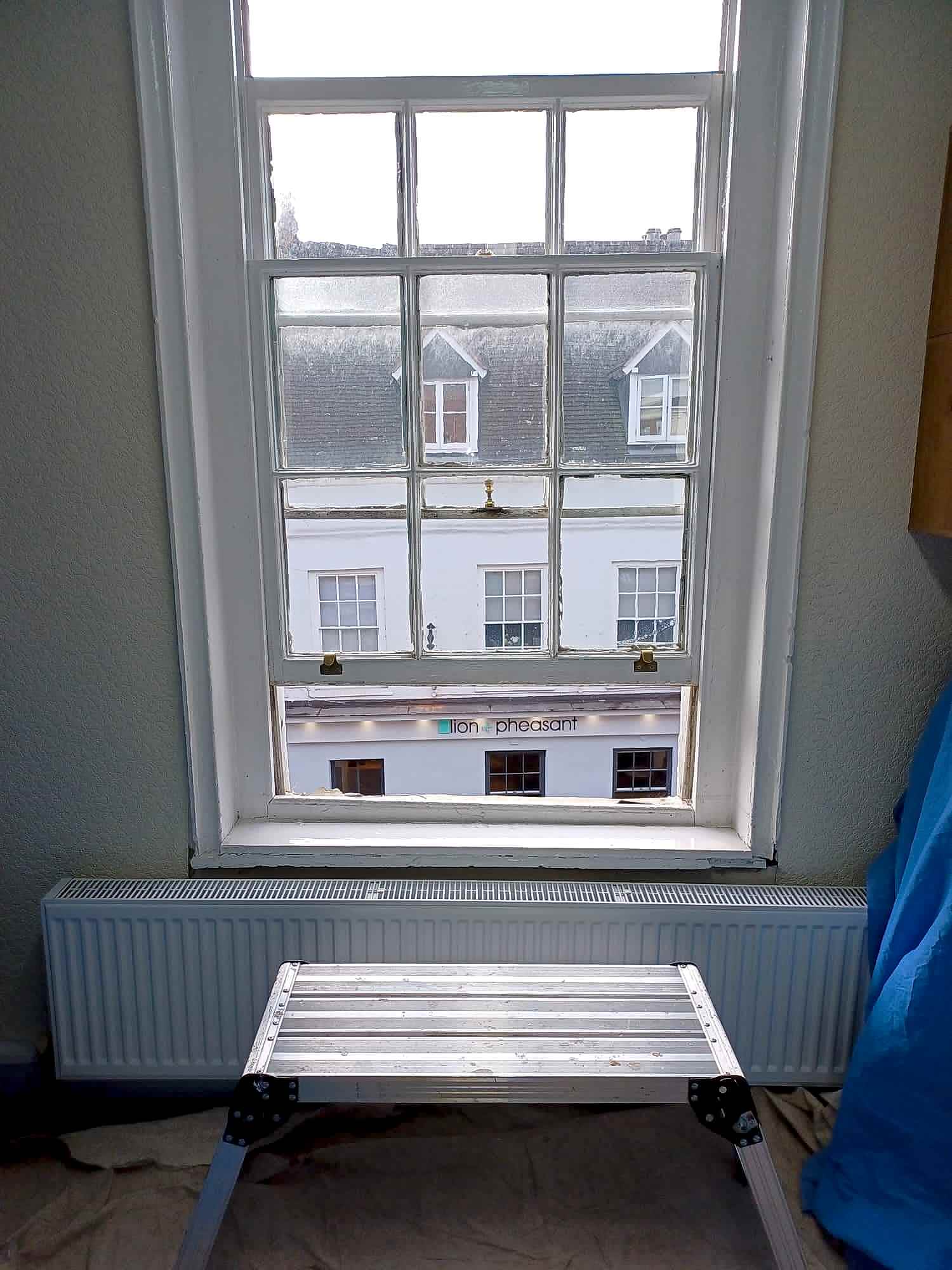 Details : x3 double glazed sashes installed into existing frames and decoration. Existing frames had subsided a lot. Grade 2 listed building with planning consent approved. The lower half of the boxes were completely rebuilt including replacement cills, outerjambs and pulley stiles. The frames were re-sealed to the brickworks.